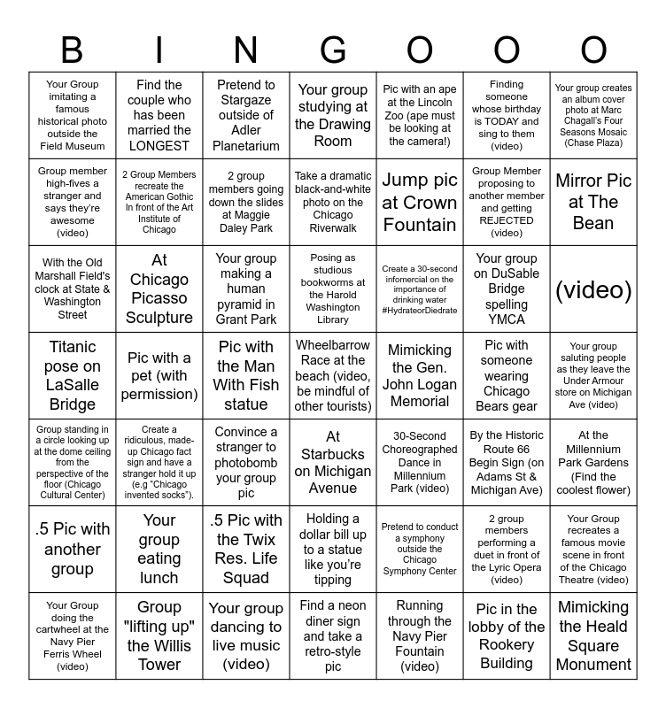 This bingo card has 49 words: 2 group members performing a duet in front of the Lyric Opera (video), Group Member proposing to another member and getting REJECTED (video), Running through the Navy Pier Fountain (video), Pic with a pet (with permission), Your group making a human pyramid in Grant Park, Your group saluting people as they leave the Under Armour store on Michigan Ave (video), Find the couple who has been married the LONGEST, Your group dancing to live music (video), Finding someone whose birthday is TODAY and sing to them (video), At Starbucks on Michigan Avenue, Your group creates an album cover photo at Marc Chagall’s Four Seasons Mosaic (Chase Plaza), Your group studying at the Drawing Room, Your group on DuSable Bridge spelling YMCA, Create a 30-second infomercial on the importance of drinking water #HydrateorDiedrate, Your group eating lunch, Pic with someone wearing Chicago Bears gear, Group member high-fives a stranger and says they’re awesome (video), Mirror Pic at The Bean, Your Group recreates a famous movie scene in front of the Chicago Theatre (video), Pic with an ape at the Lincoln Zoo (ape must be looking at the camera!), Jump pic at Crown Fountain, Pic with the Man With Fish statue, Your Group imitating a famous historical photo outside the Field Museum, 2 Group Members recreate the American Gothic In front of the Art Institute of Chicago, Your Group doing the cartwheel at the Navy Pier Ferris Wheel (video), 2 group members going down the slides at Maggie Daley Park, (video), Group "lifting up" the Willis Tower, Posing as studious bookworms at the Harold Washington Library, At Chicago Picasso Sculpture, Mimicking the Heald Square Monument, Mimicking the Gen. John Logan Memorial, .5 Pic with another group, .5 Pic with the Twix Res. Life Squad, Titanic pose on LaSalle Bridge, 30-Second Choreographed Dance in Millennium Park (video), By the Historic Route 66 Begin Sign (on Adams St & Michigan Ave), At the Millennium Park Gardens (Find the coolest flower), With the Old Marshall Field's clock at State & Washington Street, Convince a stranger to photobomb your group pic, Holding a dollar bill up to a statue like you’re tipping, Group standing in a circle looking up at the dome ceiling from the perspective of the floor (Chicago Cultural Center), Wheelbarrow Race at the beach (video, be mindful of other tourists), Find a neon diner sign and take a retro-style pic, Take a dramatic black-and-white photo on the Chicago Riverwalk, Pretend to Stargaze outside of Adler Planetarium, Pretend to conduct a symphony outside the Chicago Symphony Center, Create a ridiculous, made-up Chicago fact sign and have a stranger hold it up (e.g “Chicago invented socks”). and Pic in the lobby of the Rookery Building.