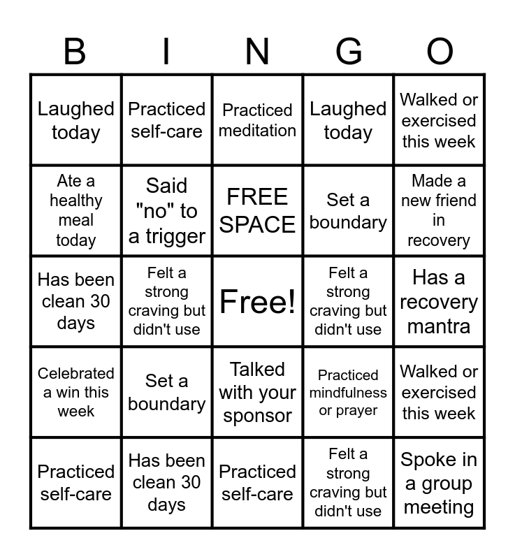This bingo card has a free space and 75 words: Attended a meeting, Talked with your sponsor, Practiced meditation, Has a sober date in the last 3 months, Did something creative this week, Talked about feelings, Has a favorite recovery quote, Journaled or reflected, Practiced mindfulness or prayer, Made a new friend in recovery, Set a boundary, Has a sober role model, FREE SPACE, Ate a healthy meal today, Has a recovery mantra, Felt a strong craving but didn't use, Read something recovery related, Spoke in a group meeting, Helped someone else this past week, Walked or exercised this week, Celebrated a win this week, Has been clean 30 days, Said "no" to a trigger, Practiced self-care, Laughed today, Attended a meeting, Talked with your sponsor, Practiced meditation, Has a clean date in the last 3 months, Did something creative this week, Talked about feelings, Has a favorite recovery quote, Journaled or reflected, Practiced mindfulness or prayer, Made a new friend in recovery, Set a boundary, Has a sober role model, Ate a healthy meal today, Has a recovery mantra, Felt a strong craving but didn't use, Read something recovery related, Spoke in a group meeting, Helped someone else this past week, Walked or exercised this week, Celebrated a win this week, Has been clean 30+ days, Practiced self-care, Laughed today, Cleaned up, Helped someone else in recovery, Attended a meeting, Talked with your sponsor, Practiced meditation, Has a clean date in the last 3 months, Did something creative this week, Talked about feelings, Has a favorite recovery quote, Journaled or reflected, Practiced mindfulness or prayer, Made a new friend in recovery, Set a boundary, Has a sober role model, Cleaned up, Ate a healthy meal today, Has a recovery mantra, Felt a strong craving but didn't use, Read something recovery related, Spoke in a group meeting, Helped someone else this past week, Walked or exercised this week, Celebrated a win this week, Has been clean 30 days, Said "no" to a trigger, Practiced self-care and Laughed today.
