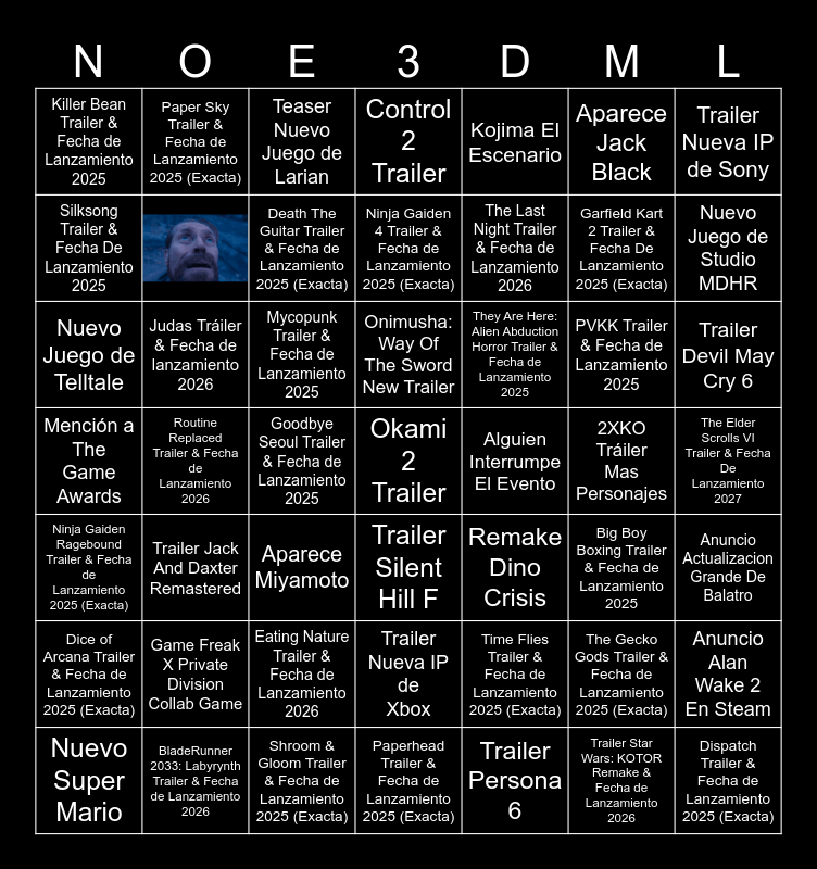 This bingo card has 1 images, a free space and 47 words: Time Flies Trailer & Fecha de Lanzamiento 2025 (Exacta), Garfield Kart 2 Trailer & Fecha De Lanzamiento 2025 (Exacta), Paperhead Trailer & Fecha de Lanzamiento 2025 (Exacta), Routine Replaced Trailer & Fecha de Lanzamiento 2026, Mycopunk Trailer & Fecha de Lanzamiento 2025, The Elder Scrolls VI Trailer & Fecha De Lanzamiento 2027, Paper Sky Trailer & Fecha de Lanzamiento 2025 (Exacta), BladeRunner 2033: Labyrynth Trailer & Fecha de Lanzamiento 2026, Aparece Jack Black, Trailer Silent Hill F, Trailer Nueva IP de Sony, Control 2 Trailer, PVKK Trailer & Fecha de Lanzamiento 2025, They Are Here: Alien Abduction Horror Trailer & Fecha de Lanzamiento 2025, Dice of Arcana Trailer & Fecha de Lanzamiento 2025 (Exacta), 2XKO Tráiler Mas Personajes, Silksong Trailer & Fecha De Lanzamiento 2025, Nuevo Juego de Studio MDHR, The Gecko Gods Trailer & Fecha de Lanzamiento 2025 (Exacta), Kojima El Escenario, The Last Night Trailer & Fecha de Lanzamiento 2026, Goodbye Seoul Trailer & Fecha de Lanzamiento 2025, Killer Bean Trailer & Fecha de Lanzamiento 2025, Anuncio Alan Wake 2 En Steam, Death The Guitar Trailer & Fecha de Lanzamiento 2025 (Exacta), Trailer Devil May Cry 6, Nuevo Super Mario, Onimusha: Way Of The Sword New Trailer, Judas Tráiler & Fecha de lanzamiento 2026, Trailer Star Wars: KOTOR Remake & Fecha de Lanzamiento 2026, Alguien Interrumpe El Evento, Anuncio Actualizacion Grande De Balatro, Game Freak X Private Division Collab Game, Mención a The Game Awards, Remake Dino Crisis, Big Boy Boxing Trailer & Fecha de Lanzamiento 2025, Nuevo Juego de Telltale, Aparece Miyamoto, Eating Nature Trailer & Fecha de Lanzamiento 2026, Ninja Gaiden Ragebound Trailer & Fecha de Lanzamiento 2025 (Exacta), Dispatch Trailer & Fecha de Lanzamiento 2025 (Exacta), Teaser Nuevo Juego de Larian, Shroom & Gloom Trailer & Fecha de Lanzamiento 2025 (Exacta), Ninja Gaiden 4 Trailer & Fecha de Lanzamiento 2025 (Exacta), Trailer Nueva IP de Xbox, Trailer Jack And Daxter Remastered and Trailer Persona 6.