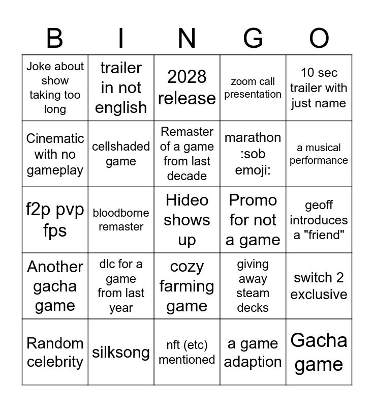 This bingo card has a free space and 24 words: dlc for a game from last year, silksong, Remaster of a game from last decade, Random celebrity, 10 sec trailer with just name, Joke about show taking too long, Cinematic with no gameplay, trailer in not english, Promo for not a game, cozy farming game, marathon :sob emoji:, f2p pvp fps, giving away steam decks, switch 2 exclusive, cellshaded game, a game adaption, geoff introduces a "friend", 2028 release, a musical performance, bloodborne remaster, Gacha game, Another gacha game, zoom call presentation and nft (etc) mentioned.