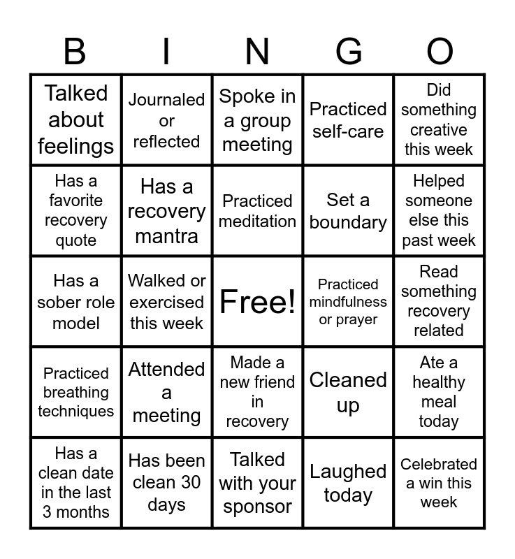 This bingo card has a free space and 25 words: Attended a meeting, Talked with your sponsor, Practiced meditation, Has a clean date in the last 3 months, Did something creative this week, Talked about feelings, Has a favorite recovery quote, Journaled or reflected, Practiced mindfulness or prayer, Made a new friend in recovery, Set a boundary, Has a sober role model, Cleaned up, Ate a healthy meal today, Has a recovery mantra, Felt a strong craving but didn't use, Read something recovery related, Spoke in a group meeting, Helped someone else this past week, Walked or exercised this week, Celebrated a win this week, Has been clean 30 days, Practiced breathing techniques, Practiced self-care and Laughed today.