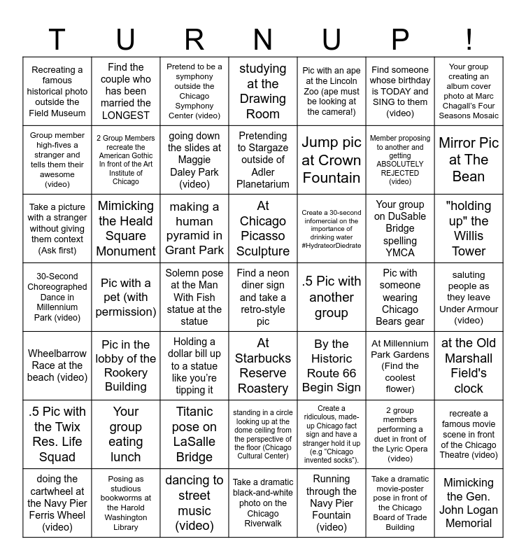 This bingo card has 49 words: 2 group members performing a duet in front of the Lyric Opera (video), Member proposing to another and getting ABSOLUTELY REJECTED (video), Running through the Navy Pier Fountain (video), Pic with a pet (with permission), making a human pyramid in Grant Park, saluting people as they leave Under Armour (video), Find the couple who has been married the LONGEST, dancing to street music (video), Find someone whose birthday is TODAY and SING to them (video), At Starbucks Reserve Roastery, Your group creating an album cover photo at Marc Chagall’s Four Seasons Mosaic, studying at the Drawing Room, Your group on DuSable Bridge spelling YMCA, Create a 30-second infomercial on the importance of drinking water #HydrateorDiedrate, Your group eating lunch, Pic with someone wearing Chicago Bears gear, Group member high-fives a stranger and tells them their awesome (video), Mirror Pic at The Bean, recreate a famous movie scene in front of the Chicago Theatre (video), Pic with an ape at the Lincoln Zoo (ape must be looking at the camera!), Jump pic at Crown Fountain, Solemn pose at the Man With Fish statue at the statue, Recreating a famous historical photo outside the Field Museum, 2 Group Members recreate the American Gothic In front of the Art Institute of Chicago, doing the cartwheel at the Navy Pier Ferris Wheel (video), going down the slides at Maggie Daley Park (video), "holding up" the Willis Tower, Posing as studious bookworms at the Harold Washington Library, At Chicago Picasso Sculpture, Mimicking the Heald Square Monument, Mimicking the Gen. John Logan Memorial, .5 Pic with another group, .5 Pic with the Twix Res. Life Squad, Titanic pose on LaSalle Bridge, 30-Second Choreographed Dance in Millennium Park (video), By the Historic Route 66 Begin Sign, At Millennium Park Gardens (Find the coolest flower), at the Old Marshall Field's clock, Take a picture with a stranger without giving them context (Ask first), Holding a dollar bill up to a statue like you’re tipping it, standing in a circle looking up at the dome ceiling from the perspective of the floor (Chicago Cultural Center), Wheelbarrow Race at the beach (video), Find a neon diner sign and take a retro-style pic, Take a dramatic black-and-white photo on the Chicago Riverwalk, Pretending to Stargaze outside of Adler Planetarium, Pretend to be a symphony outside the Chicago Symphony Center (video), Create a ridiculous, made-up Chicago fact sign and have a stranger hold it up (e.g “Chicago invented socks”)., Pic in the lobby of the Rookery Building and Take a dramatic movie-poster pose in front of the Chicago Board of Trade Building.