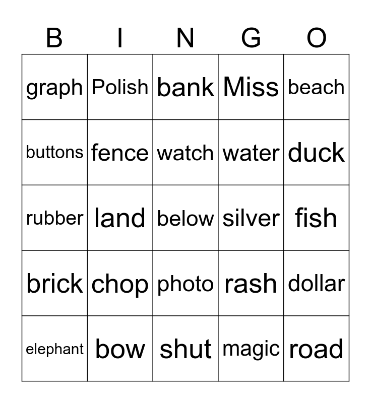 This bingo card has a free space and 39 words: Eagles, victory, snack, fence, elephant, photo, watch, weather, beach, brick, land, Miss, road, fish, silver, chop, island, graph, above, rash, buttons, shut, water, duck, see, sea, son, sun, to, too, two, by, bye, buy, there, their,they're, Polish, can, minute, bank, bow, magic, trick, dollar, rubber and mark.
