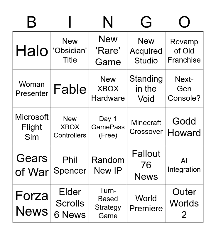 This bingo card has a free space and 24 words: Phil Spencer, Elder Scrolls 6 News, New XBOX Hardware, Forza News, Revamp of Old Franchise, Halo, Woman Presenter, New 'Obsidian' Title, Minecraft Crossover, Random New IP, Standing in the Void, Microsoft Flight Sim, Fallout 76 News, AI Integration, Fable, World Premiere, Godd Howard, New 'Rare' Game, Next-Gen Console?, New XBOX Controllers, Outer Worlds 2, Gears of War, New Acquired Studio and Turn-Based Strategy Game.