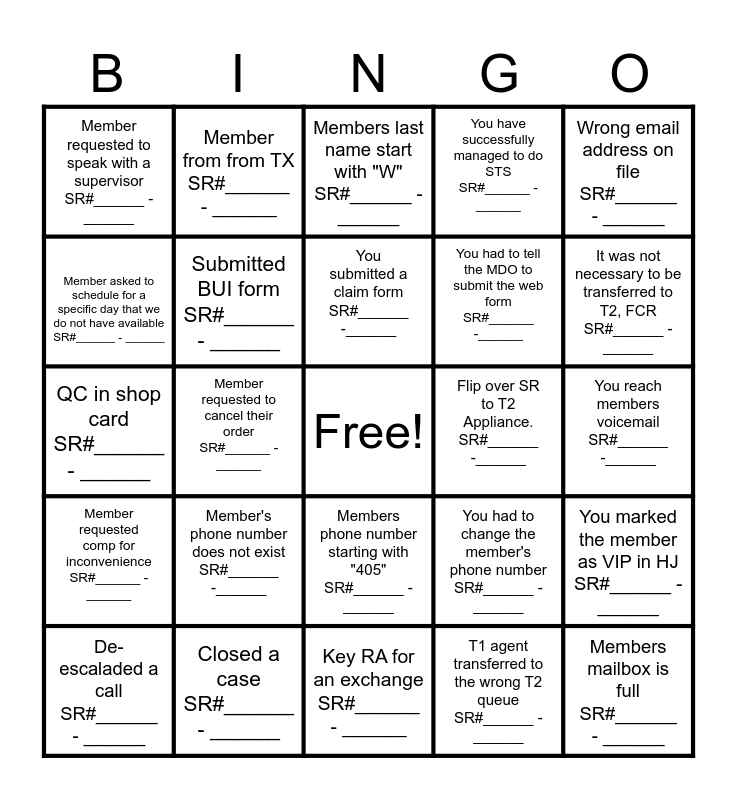 This bingo card has a free space and 34 words: Set a 24hrs follow up SR#______ - ______, T1 agent transferred to the wrong T2 queue SR#______ - ______, You had to contact RCM SR#______ - ______, Key RA for a refund SR#______ - ______, Member requested comp for inconvenience SR#______ - ______, Submitted BUI form SR#______ - ______, Wrong email address on file SR#______ - ______, De-escaladed a call SR#______ - ______, Member from from TX SR#______ - ______, Street name that starts with "D" SR#______ - ______, You submitted a claim form SR#______ -______, Members last name start with "W" SR#______ - ______, Member with the first name Brian SR#______ - ______, You had to send a CAT to the MDO SR#______ -______, Flip over SR to T2 Appliance. SR#______ -______, It was not necessary to be transferred to T2, FCR SR#______ - ______, Closed a case SR#______ - ______, QC in shop card SR#______ - ______, Member's phone number does not exist SR#______ -______, You had to change the member's phone number SR#______ - ______, Members phone number starting with "405" SR#______ - ______, Can you call me later? SR#______ - ______, Member requested to speak with a supervisor SR#______ - ______, You reach members voicemail SR#______ -______, Key RA for an exchange SR#______ - ______, Members mailbox is full SR#______ - ______, You have successfully managed to do STS SR#______ - ______, You needed to use as400 SR#______ -______, You had to tell the MDO to submit the web form SR#______ -______, Member asked to schedule for a specific day that we do not have available SR#______ - ______, Address verification SR#______ - ______, Member requested to cancel their order SR#______ - ______, You marked the member as VIP in HJ SR#______ - ______ and Total order value was more than $3000 SR#______ -______.