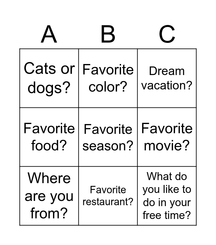 This bingo card has 9 words: Where are you from?, Dream vacation?, Favorite color?, Favorite food?, Cats or dogs?, Favorite movie?, Favorite season?, What do you like to do in your free time? and Favorite restaurant?.