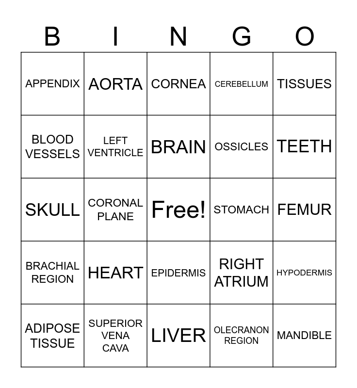 This bingo card has a free space and 24 words: ADIPOSE TISSUE, HEART, BRAIN, OLECRANON REGION, TISSUES, APPENDIX, AORTA, CORNEA, STOMACH, FEMUR, SKULL, LEFT VENTRICLE, RIGHT ATRIUM, HYPODERMIS, BLOOD VESSELS, SUPERIOR VENA CAVA, LIVER, CEREBELLUM, TEETH, BRACHIAL REGION, CORONAL PLANE, EPIDERMIS, OSSICLES and MANDIBLE.