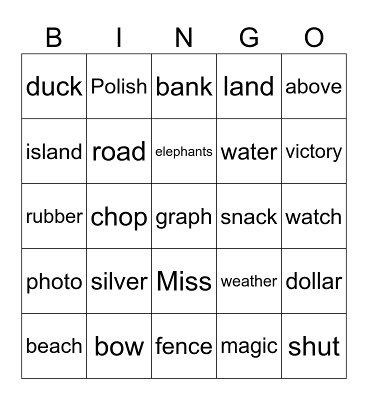This bingo card has a free space and 39 words: Eagles, rash, buttons, road, beach, Miss, elephants, brick, above, photo, chop, land, shut, watch, snack, silver, fish, duck, below, weather, island, fence, water, victory, see, sea, to, too, two, by, bye,buy, there, their, they're, sun, son, Polish, can, minute, bank, bow, magic, trick, dollar, rubber and mark.