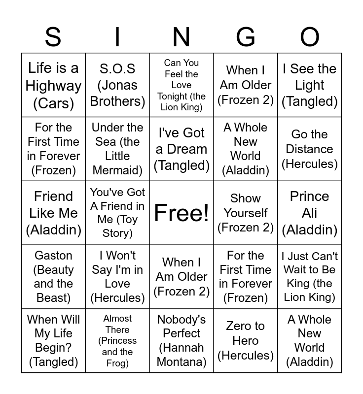 This bingo card has a free space and 36 words: In Summer (Frozen), You're Welcome (Moana), Immortals (Big Hero 6), Under the Sea (the Little Mermaid), For the First Time in Forever (Frozen), Gaston (Beauty and the Beast), I've Got a Dream (Tangled), Un Poco Loco (Coco), I See the Light (Tangled), Burnin' Up (Jonas Brothers), You've Got A Friend in Me (Toy Story), When I Am Older (Frozen 2), I'll Make a Man Out of You (Mulan), Show Yourself (Frozen 2), Go the Distance (Hercules), Life is a Highway (Cars), Shiny (Moana), I Won't Say I'm in Love (Hercules), A Whole New World (Aladdin), Can You Feel the Love Tonight (the Lion King), Prince Ali (Aladdin), I Just Can't Wait to Be King (the Lion King), Almost There (Princess and the Frog), When Will My Life Begin? (Tangled), Nobody's Perfect (Hannah Montana), S.O.S (Jonas Brothers), Friend Like Me (Aladdin), Lovebug (Jonas Brothers), A Whole New World (Aladdin), For the First Time in Forever (Frozen), Everybody Wants to be a Cat (Aristocats), Can You Feel the Love Tonight (the Lion King), Zero to Hero (Hercules), When I Am Older (Frozen 2), Remember Me (Coco) and Un Poco Loco (Coco).