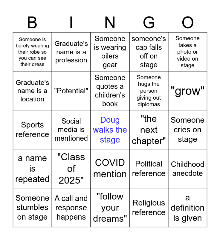 This bingo card has a free space and 24 words: "Class of 2025", A call and response happens, Someone quotes a children's book, Someone stumbles on stage, Someone takes a photo or video on stage, Someone is barely wearing their robe so you can see their dress, Graduate's name is a location, Graduate's name is a profession, "the next chapter", COVID mention, Someone hugs the person giving out diplomas, Sports reference, Political reference, Childhood anecdote, "Potential", Religious reference, Someone cries on stage, Someone is wearing oilers gear, "grow", Social media is mentioned, a definition is given, a name is repeated, someone's cap falls off on stage and "follow your dreams".