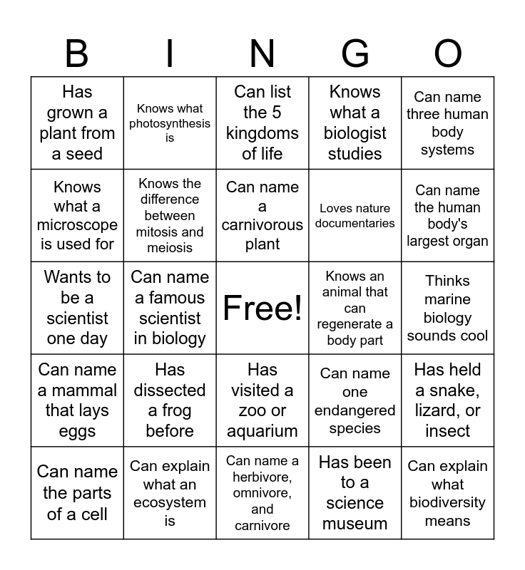 This bingo card has a free space and 24 words: Can name the parts of a cell, Has dissected a frog before, Can name a carnivorous plant, Has been to a science museum, Can name three human body systems, Has grown a plant from a seed, Knows what photosynthesis is, Can list the 5 kingdoms of life, Knows an animal that can regenerate a body part, Thinks marine biology sounds cool, Wants to be a scientist one day, Knows the difference between mitosis and meiosis, Can name one endangered species, Has held a snake, lizard, or insect, Knows what a microscope is used for, Can explain what an ecosystem is, Can name a herbivore, omnivore, and carnivore, Knows what a biologist studies, Can name the human body's largest organ, Can name a mammal that lays eggs, Can name a famous scientist in biology, Has visited a zoo or aquarium, Loves nature documentaries and Can explain what biodiversity means.
