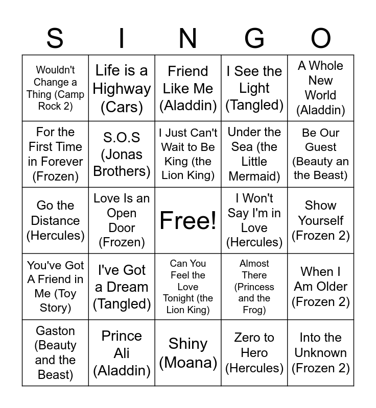 This bingo card has a free space and 36 words: In Summer (Frozen), You're Welcome (Moana), Immortals (Big Hero 6), Under the Sea (the Little Mermaid), Into the Unknown (Frozen 2), Gaston (Beauty and the Beast), I've Got a Dream (Tangled), Dig a Little Deeper (Princess and the Frog), I See the Light (Tangled), Burnin' Up (Jonas Brothers), You've Got A Friend in Me (Toy Story), Love Is an Open Door (Frozen), I'll Make a Man Out of You (Mulan), Show Yourself (Frozen 2), Go the Distance (Hercules), Life is a Highway (Cars), Shiny (Moana), I Won't Say I'm in Love (Hercules), Be Our Guest (Beauty an the Beast), Wouldn't Change a Thing (Camp Rock 2), Prince Ali (Aladdin), I Just Can't Wait to Be King (the Lion King), Almost There (Princess and the Frog), When Will My Life Begin? (Tangled), Nobody's Perfect (Hannah Montana), S.O.S (Jonas Brothers), Friend Like Me (Aladdin), Lovebug (Jonas Brothers), A Whole New World (Aladdin), For the First Time in Forever (Frozen), Everybody Wants to be a Cat (Aristocats), Can You Feel the Love Tonight (the Lion King), Zero to Hero (Hercules), When I Am Older (Frozen 2), Remember Me (Coco) and Un Poco Loco (Coco).