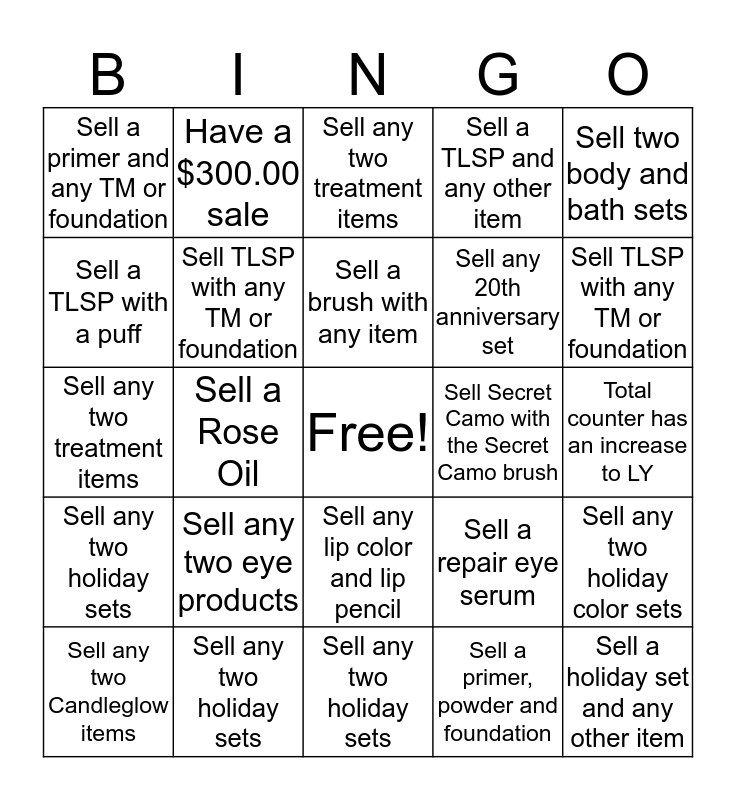 This bingo card has a free space and 24 words: Sell any two eye products, Sell any two holiday sets, Sell a brush with any item, Sell any two Candleglow items, Sell two body and bath sets, Sell a primer and any TM or foundation, Sell a TLSP with a puff, Have a $300.00 sale, Sell Secret Camo with the Secret Camo brush, Sell any lip color and lip pencil, Sell any 20th anniversary set, Sell any two treatment items, Sell a repair eye serum, Sell any two holiday color sets, Sell TLSP with any TM or foundation, Sell a primer, powder and foundation, Total counter has an increase to LY, Sell any two treatment items, Sell TLSP with any TM or foundation, Sell a Rose Oil, Sell a holiday set and any other item, Sell any two holiday sets, Sell a TLSP and any other item and Sell any two holiday sets.