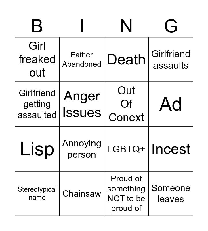 This bingo card has 16 words: Chainsaw, Incest, Death, Girl freaked out, Lisp, Father Abandoned, LGBTQ+, Proud of something NOT to be proud of, Girlfriend getting assaulted, Anger Issues, Stereotypical name, Girlfriend assaults, Annoying person, Ad, Out Of Conext and Someone leaves.