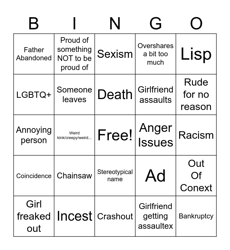 This bingo card has a free space and 24 words: Chainsaw, Incest, Death, Girl freaked out, Lisp, Father Abandoned, LGBTQ+, Proud of something NOT to be proud of, Anger Issues, Stereotypical name, Girlfriend assaults, Annoying person, Ad, Out Of Conext, Someone leaves, Girlfriend getting assaultex, Racism, Sexism, Rude for no reason, Weird kink/creepy/weird..., Bankruptcy, Coincidence, Overshares a bit too much and Crashout.