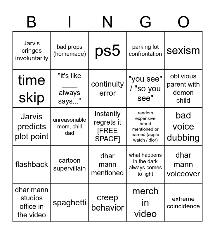 This bingo card has a free space and 28 words: dhar mann voiceover, dhar car, "you see" / "so you see", merch in video, time skip, ps5, bad props (homemade), flashback, random expensive brand mentioned or named (apple watch / dior), dhar mann studios office in the video, Jarvis predicts plot point, parking lot confrontation, spaghetti, creep behavior, oblivious parent with demon child, kids with ipad, cartoon supervillain, "it's like ____ always says...", continuity error, dhar mann mentioned, Jarvis cringes involuntarily, someone fired over something small, extreme coincidence, unreasonable mom, chill dad, bad voice dubbing, what happens in the dark always comes to light, sexism and how would you feel if that happened to you/treat people the way you want to be treated.