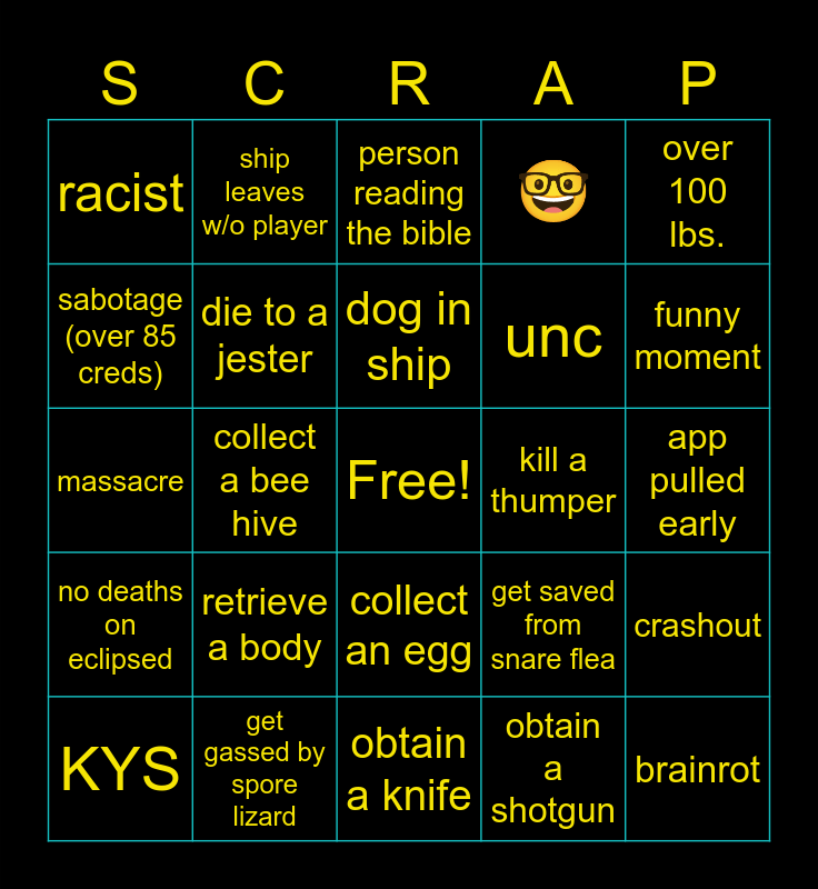 This bingo card has a free space and 29 words: KYS, Rock a maneater, collect a bee hive, host leaves, racist, person reading the bible, die to a jester, retrieve a body, kill a thumper, get gassed by spore lizard, app pulled early, brainrot, obtain a knife, obtain a shotgun, funny moment, kill another player, collect an egg, no deaths on eclipsed, over 100 lbs., massacre, get saved from snare flea, under 13, unc, sabotage (over 85 creds), 🤓, ship leaves w/o player, crashout, dog in ship and witness a death.