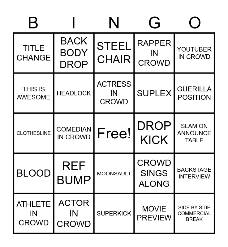 This bingo card has a free space and 24 words: REF BUMP, ACTOR IN CROWD, ACTRESS IN CROWD, ATHLETE IN CROWD, YOUTUBER IN CROWD, TITLE CHANGE, THIS IS AWESOME, BACK BODY DROP, DROP KICK, MOONSAULT, SUPLEX, CLOTHESLINE, CROWD SINGS ALONG, BACKSTAGE INTERVIEW, HEADLOCK, MOVIE PREVIEW, SLAM ON ANNOUNCE TABLE, STEEL CHAIR, GUERILLA POSITION, COMEDIAN IN CROWD, SIDE BY SIDE COMMERCIAL BREAK, BLOOD, RAPPER IN CROWD and SUPERKICK.