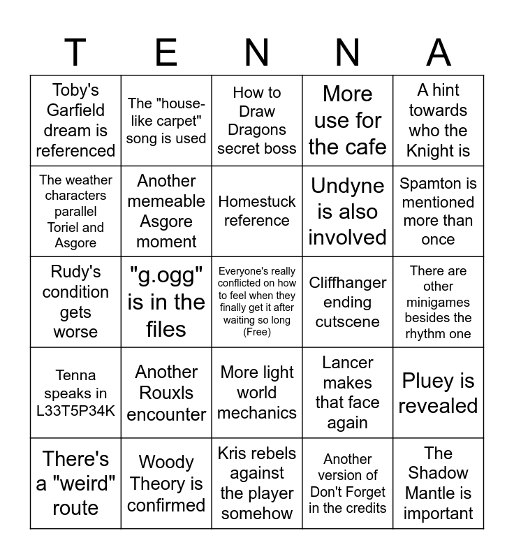 This bingo card has a free space and 24 words: Another Rouxls encounter, Woody Theory is confirmed, Homestuck reference, There's a "weird" route, A hint towards who the Knight is, Toby's Garfield dream is referenced, The weather characters parallel Toriel and Asgore, The "house-like carpet" song is used, Cliffhanger ending cutscene, More light world mechanics, Undyne is also involved, Rudy's condition gets worse, Lancer makes that face again, Pluey is revealed, Another memeable Asgore moment, Another version of Don't Forget in the credits, There are other minigames besides the rhythm one, How to Draw Dragons secret boss, Spamton is mentioned more than once, "g.ogg" is in the files, The Shadow Mantle is important, Tenna speaks in L33T5P34K, More use for the cafe and Kris rebels against the player somehow.