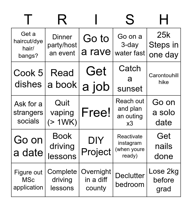 This bingo card has a free space and 24 words: Book driving lessons, Complete driving lessons, Get a job, Figure out MSc application, 25k Steps in one day, Get a haircut/dye hair/ bangs?, Cook 5 dishes, Dinner party/host an event, Reach out and plan an outing x3, DIY Project, Catch a sunset, Ask for a strangers socials, Reactivate instagram (when youre ready), Get nails done, Read a book, Declutter bedroom, Go on a solo date, Go to a rave, Carontouhill hike, Quit vaping (> 1WK), Lose 2kg before grad, Go on a date, Go on a 3-day water fast and Overnight in a diff county.