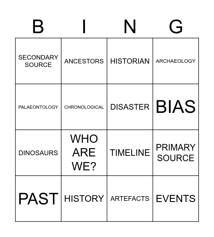 This bingo card has 16 words: PAST, HISTORY, HISTORIAN, ARCHAEOLOGY, PALAEONTOLOGY, ANCESTORS, TIMELINE, PRIMARY SOURCE, SECONDARY SOURCE, CHRONOLOGICAL, ARTEFACTS, BIAS, DINOSAURS, WHO ARE WE?, DISASTER and EVENTS.