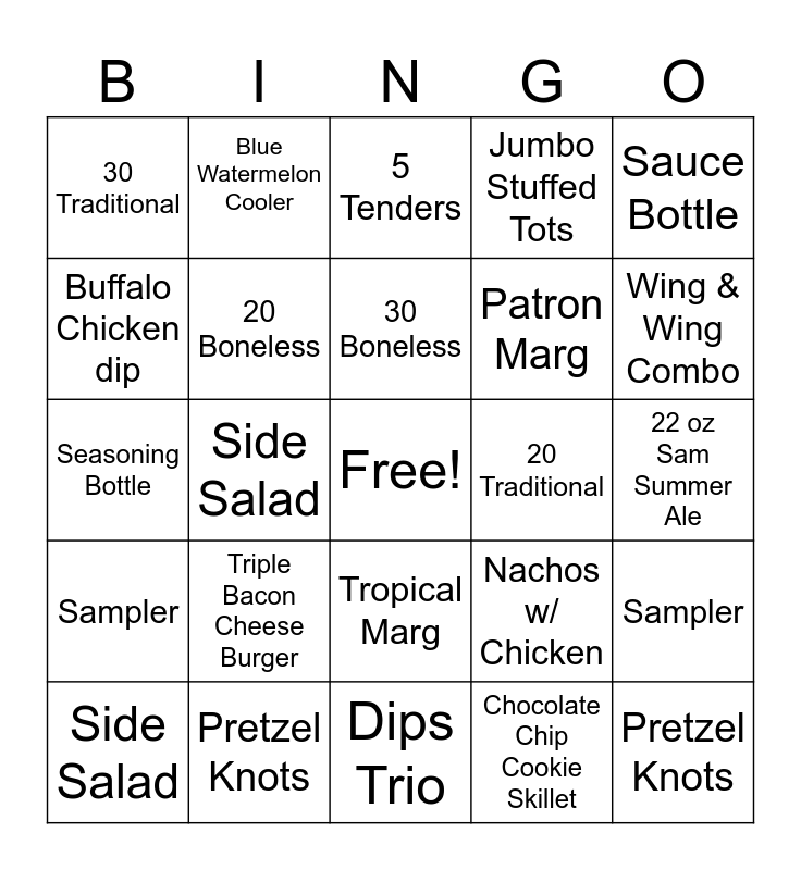 This bingo card has a free space and 24 words: Triple Bacon Cheese Burger, Pretzel Knots, 30 Boneless, Side Salad, Sauce Bottle, 30 Traditional, Buffalo Chicken dip, Blue Watermelon Cooler, 20 Traditional, Tropical Marg, Patron Marg, Seasoning Bottle, Nachos w/ Chicken, Sampler, 20 Boneless, Chocolate Chip Cookie Skillet, 22 oz Sam Summer Ale, 5 Tenders, Wing & Wing Combo, Side Salad, Pretzel Knots, Sampler, Jumbo Stuffed Tots and Dips Trio.