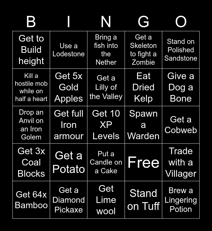 This bingo card has 25 words: Get a Potato, Get Lime wool, Get a Lilly of the Valley, Get 64x Bamboo, Stand on Polished Sandstone, Get to Build height, Kill a hostile mob while on half a heart, Use a Lodestone, Spawn a Warden, Put a Candle on a Cake, Eat Dried Kelp, Drop an Anvil on an Iron Golem, Free, Trade with a Villager, Get 5x Gold Apples, Brew a Lingering Potion, Get a Cobweb, Bring a fish into the Nether, Give a Dog a Bone, Get full Iron armour, Get 10 XP Levels, Get a Diamond Pickaxe, Get 3x Coal Blocks, Get a Skeleton to fight a Zombie and Stand on Tuff.