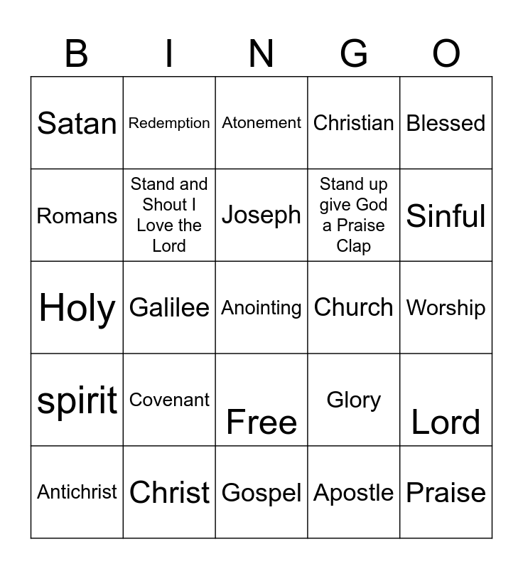 This bingo card has 45 words: Communion, Anointing, Angel, Antichrist, Apocalypse, Apostle, Atonement, Bible, Blessed, Christ, Christian, Church, Free, Covenant, Faith, Gospel, . Grace, Holy, Testament, Sinful, Redemption, Repentance, Righteousness, Satan, Bear Witness, Worship, Savior, Flock, Glory, spirit, Father, Lord, Prosper, Needs, Wisdom, Galilee, Prophecy, Gensis, Praise, Joseph, Romans, Stand up give God a Praise Clap, Face left and tell the person it's good to see you, Stand and Shout I Love the Lord and Give God the highest praise.