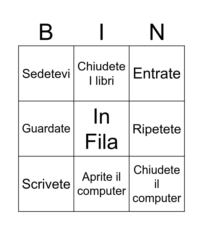 This bingo card has 18 words: Free!, Alzate la mano, Entrate, Sedetevi, Alzatevi, Guardate, Aprite I libri, Chiudete I libri, Aprite il computer, Chiudete il computer, Silenzio, In Fila, Ascoltate, Ripetete, Scrivete, Non capisco, Prego and Grazie.