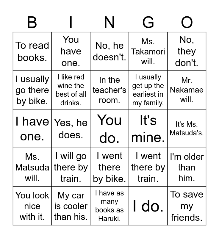 This bingo card has 64 words: Free!, I went there by car., I went there by bus., I went there by bike., I went there by train., I went there on foot., To read books., To see my friends., In the teacher's room., To buy some food., To save my friends., It is in my pocket., Yes, he does., No, he doesn't., Yes, they do., No, they don't., I have one., You have one., Japanese food is the most popular in the world., I usually get up the earliest in my family., I'm older than him., You look nice with it., I like red wine the best of all drinks., I like to travel with my family., K2 is the second highest mountain in the world., Yes, I will., He is younger than me., I am as tall as him., I have as many books as Haruki., I do., Mr. Nakame is the coolest teacher in this school., I like Korean food., I'd like some tea., I'd like to eat some french fries., It's mine., I am., Kaori is the most powerful in this school., My car is cooler than his., Mr. Fujihara will., Ms. Takamori will., Mr. Nakamae will., Ms. Matsuda will., It's Mr. Fujihara's., It's Ms. Takamori's., It's Mr. Nakamae's., It's Ms. Matsuda's., To relax., You are., You do., I will go there by car., I will go there by bus., I will go there by bike., I will go there by train., I will go there on foot., I usually go there by car., I usually go there by bus., I usually go there by bike., I usually go there by train., I usually go there on foot., I have been there many times., I have never been there., Oh, are you?, Oh, do you? and Oh, did you?.