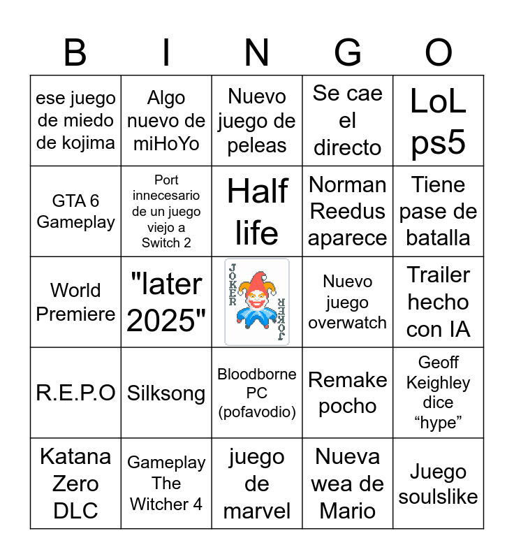 This bingo card has a free space and 24 words: Silksong, Gameplay The Witcher 4, Half life, Katana Zero DLC, LoL ps5, ese juego de miedo de kojima, GTA 6 Gameplay, Algo nuevo de miHoYo, Nuevo juego overwatch, Bloodborne PC (pofavodio), Norman Reedus aparece, World Premiere, Remake pocho, Geoff Keighley dice “hype”, Port innecesario de un juego viejo a Switch 2, Nueva wea de Mario, Trailer hecho con IA, Nuevo juego de peleas, Tiene pase de batalla, "later 2025", Juego soulslike, R.E.P.O, Se cae el directo and juego de marvel.