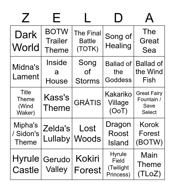 This bingo card has a free space and 24 words: Zelda's Lullaby, Gerudo Valley, Song of Storms, Hyrule Castle, The Great Sea, Dark World, Midna's Lament, BOTW Trailer Theme, Kakariko Village (OoT), Lost Woods, Ballad of the Goddess, Title Theme (Wind Waker), Dragon Roost Island, Korok Forest (BOTW), Inside a House, Hyrule Field (Twilight Princess), Great Fairy Fountain / Save Select, The Final Battle (TOTK), Ballad of the Wind Fish, Kass's Theme, Main Theme (TLoZ), Mipha's / Sidon's Theme, Song of Healing and Kokiri Forest.