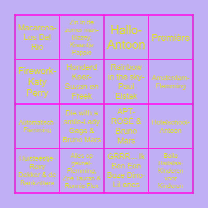 This bingo card has 43 words: Sugardaddy-Roxy Dekker, Huisfeestje-Roxy Dekker & de Bankzitters, Ga dan!-Roxy Dekker, Engelbewaarder-Marco Schuitmaker, Ik neem je mee-Gers Pardoel, Padellen-Turfygang, Hallo-Antoon, I gotta feeling-Black Eyed Peas, Firework-Katy Perry, De leukste musical ever, Première, Alles op gevoel-Flemming, Zoë Tauran & Ronnie Flex, Ushuaia-Turfy Gang, Russo, Gaan we weg?-Roxy Dekker & Ronnie Flex, Lotje, Oya Lélé-K3, Bagagedrager-Gers Pardoel, APT- ROSÉ & Bruno Mars, Waka-Noano & Emms, Die with a smile-Lady Gaga & Bruno Mars, Zin in de zomer man-Bizzey, Kraantje Pappie, Links Rechts-Snollebollekes, Terug in de tijd-Yves Berendse, Macarena-Los Del Rio, Europapa-Joost Klein, GRRR... Ik Ben Een Boze Dino-Lil ones, GA dan!-Roxy Dekker, Satisfyer-Roxy Dekker, Blauwe dag-Suzan en Freek, Baila Bailalaa-Kinderen voor Kinderen, Lekker eigenwijs-Kinderen voor Kinderen, Daba Die Daba Da-Kinderen voor Kinderen, TEXAS HOLD'EM-Beyonce, Hotelschool-Antoon, 10.000 Luchtballonnen- K3, Adrenaline- Kris Kross Amsterdam, Zoë Tauran & Ronnie Flex, Anne-Fleur Vakantie-Roxy Dekker, Amsterdam-Flemming, Honderd Keer-Suzan en Freek, Automatisch-Flemming, Shake it off-Taylor Swift, Rainbow in the sky-Paul Elstak and Pedro-Jaxomy, Agatino Romero, Rafaella Carra.