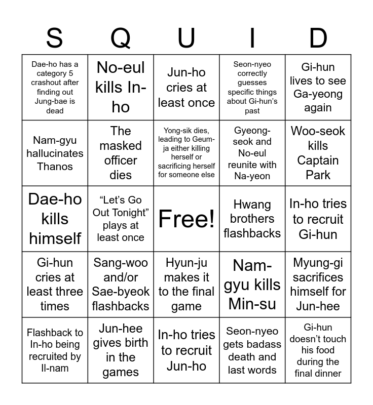 This bingo card has a free space and 24 words: Sang-woo and/or Sae-byeok flashbacks, Jun-hee gives birth in the games, Yong-sik dies, leading to Geum-ja either killing herself or sacrificing herself for someone else, Flashback to In-ho being recruited by Il-nam, Gi-hun lives to see Ga-yeong again, Dae-ho has a category 5 crashout after finding out Jung-bae is dead, Nam-gyu hallucinates Thanos, No-eul kills In-ho, Hwang brothers flashbacks, Hyun-ju makes it to the final game, Gyeong-seok and No-eul reunite with Na-yeon, Dae-ho kills himself, Nam-gyu kills Min-su, Myung-gi sacrifices himself for Jun-hee, The masked officer dies, Seon-nyeo gets badass death and last words, In-ho tries to recruit Gi-hun, Jun-ho cries at least once, Woo-seok kills Captain Park, “Let’s Go Out Tonight” plays at least once, Gi-hun doesn’t touch his food during the final dinner, Gi-hun cries at least three times, Seon-nyeo correctly guesses specific things about Gi-hun’s past and In-ho tries to recruit Jun-ho.