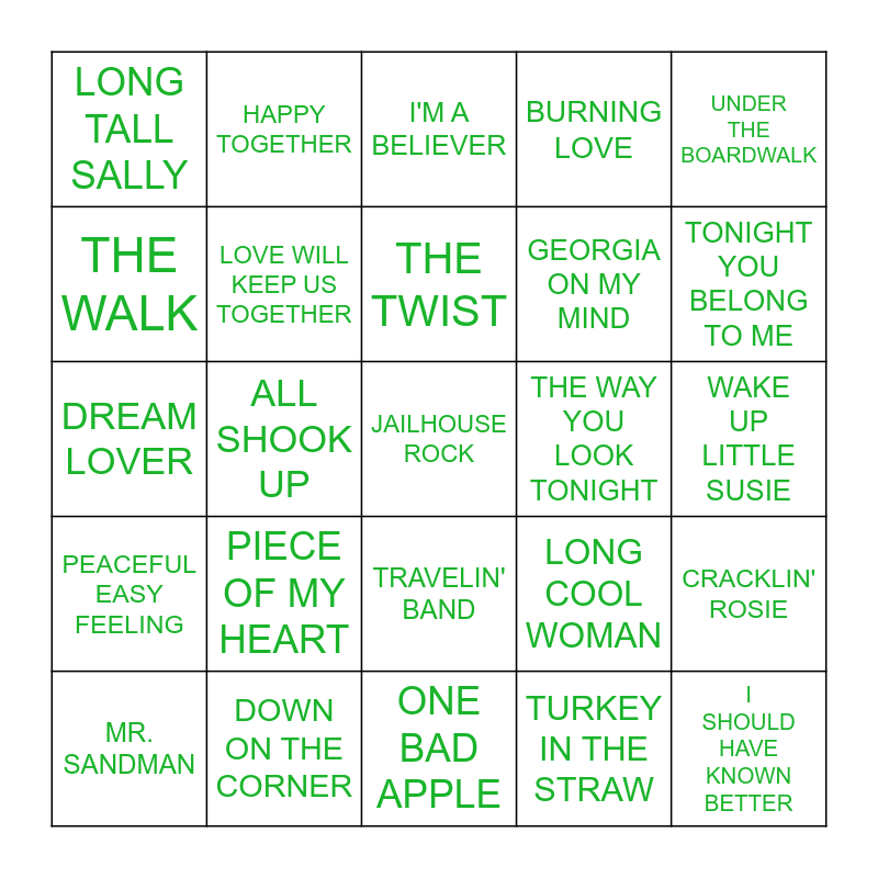 This bingo card has 40 words: WE CAN WORK IT OUT, DREAM LOVER, PEGGY SUE, LOVE WILL KEEP US TOGETHER, DOWN ON THE CORNER, TRAVELIN' BAND, THE TWIST, MAYBELLENE, UNDER THE BOARDWALK, PEACEFUL EASY FEELING, ALL SHOOK UP, BURNING LOVE, JAILHOUSE ROCK, WAKE UP LITTLE SUSIE, THE WAY YOU LOOK TONIGHT, PIECE OF MY HEART, IF YOU WANNA BE HAPPY, LONG TALL SALLY, MONDAY MONDAY, I'M A BELIEVER, CRACKLIN' ROSIE, TURKEY IN THE STRAW, GEORGIA ON MY MIND, THE WALK, EVERYDAY PEOPLE, GIMME SOME LOVIN, INCENSE AND PEPPERMINTS, BARBARA ANN, I SHOULD HAVE KNOWN BETTER, I'M LOOKING THROUGH YOU, HE'S SO FINE, MR. SANDMAN, BABY NOW THAT I'VE FOUND YOU, LONG COOL WOMAN, TONIGHT YOU BELONG TO ME, ONE BAD APPLE, WALK RIGHT IN, THE LION SLEEPS TONIGHT, HAPPY TOGETHER and JACKIE WILSON.