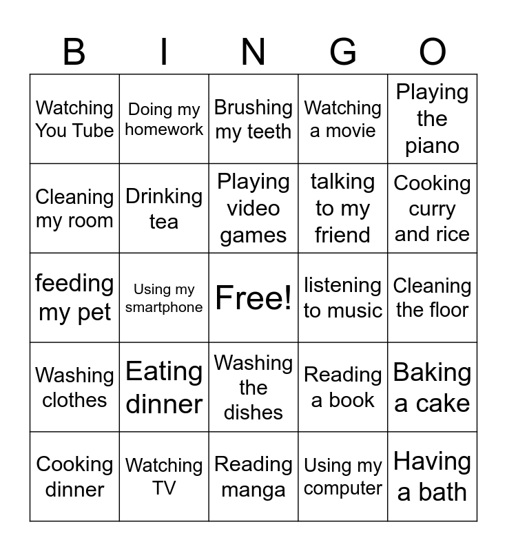 This bingo card has a free space and 24 words: Eating dinner, Watching TV, Playing video games, Cooking dinner, Playing the piano, Watching You Tube, Cleaning my room, Doing my homework, listening to music, Washing the dishes, talking to my friend, feeding my pet, Reading a book, Baking a cake, Drinking tea, Using my computer, Cleaning the floor, Brushing my teeth, Cooking curry and rice, Using my smartphone, Having a bath, Washing clothes, Watching a movie and Reading manga.