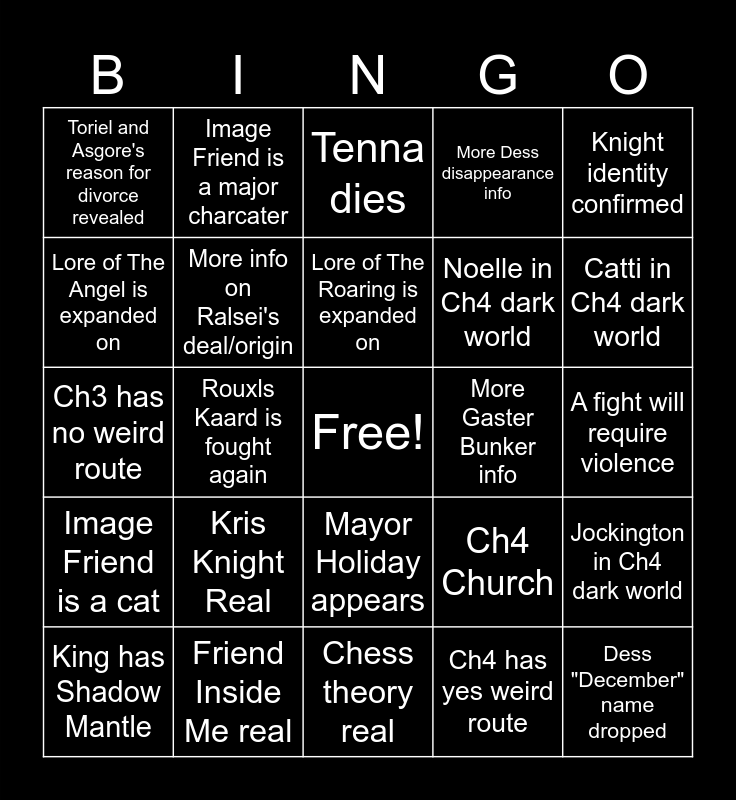 This bingo card has a free space and 24 words: Kris Knight Real, Friend Inside Me real, Lore of The Roaring is expanded on, King has Shadow Mantle, Knight identity confirmed, Toriel and Asgore's reason for divorce revealed, Lore of The Angel is expanded on, Image Friend is a major charcater, More Gaster Bunker info, Mayor Holiday appears, Noelle in Ch4 dark world, Ch3 has no weird route, Ch4 Church, Jockington in Ch4 dark world, More info on Ralsei's deal/origin, Ch4 has yes weird route, A fight will require violence, Tenna dies, Catti in Ch4 dark world, Rouxls Kaard is fought again, Dess "December" name dropped, Image Friend is a cat, More Dess disappearance info and Chess theory real.