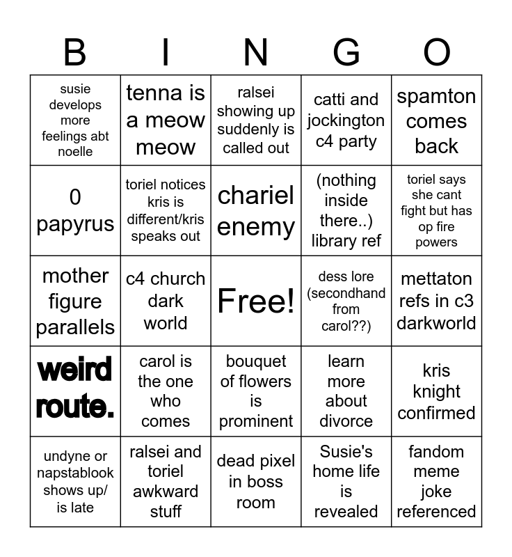 This bingo card has a free space and 24 words: carol is the one who comes, ralsei and toriel awkward stuff, chariel enemy, undyne or napstablook shows up/ is late, spamton comes back, susie develops more feelings abt noelle, 0 papyrus, tenna is a meow meow, dess lore (secondhand from carol??), bouquet of flowers is prominent, (nothing inside there..) library ref, mother figure parallels, learn more about divorce, kris knight confirmed, toriel notices kris is different/kris speaks out, Susie's home life is revealed, mettaton refs in c3 darkworld, ralsei showing up suddenly is called out, toriel says she cant fight but has op fire powers, c4 church dark world, fandom meme joke referenced, weird route., catti and jockington c4 party and dead pixel in boss room.