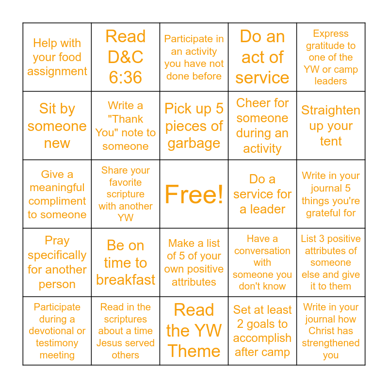 This bingo card has a free space and 24 words: Be on time to breakfast, Read in the scriptures about a time Jesus served others, Pick up 5 pieces of garbage, Participate during a devotional or testimony meeting, Express gratitude to one of the YW or camp leaders, Help with your food assignment, Sit by someone new, Read D&C 6:36, Do a service for a leader, Make a list of 5 of your own positive attributes, Cheer for someone during an activity, Give a meaningful compliment to someone, Have a conversation with someone you don't know, List 3 positive attributes of someone else and give it to them, Write a "Thank You" note to someone, Set at least 2 goals to accomplish after camp, Write in your journal 5 things you're grateful for, Participate in an activity you have not done before, Straighten up your tent, Share your favorite scripture with another YW, Write in your journal how Christ has strengthened you, Pray specifically for another person, Do an act of service and Read the YW Theme.