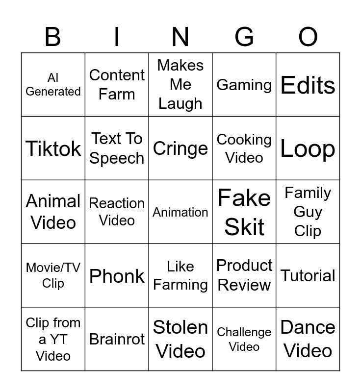 This bingo card has a free space and 24 words: Phonk, Brainrot, Cringe, Clip from a YT Video, Edits, AI Generated, Tiktok, Content Farm, Fake Skit, Like Farming, Cooking Video, Animal Video, Product Review, Tutorial, Text To Speech, Challenge Video, Family Guy Clip, Makes Me Laugh, Loop, Reaction Video, Dance Video, Movie/TV Clip, Gaming and Stolen Video.