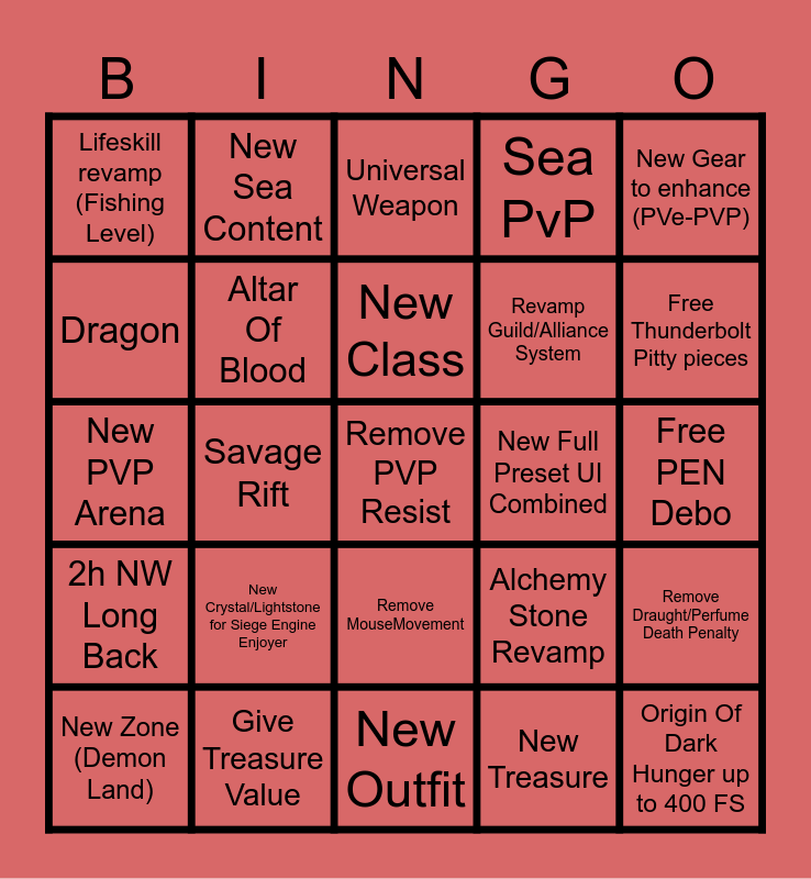 This bingo card has a free space and 24 words: New Crystal/Lightstone for Siege Engine Enjoyer, Give Treasure Value, New Class, New Zone (Demon Land), New Gear to enhance (PVe-PVP), Lifeskill revamp (Fishing Level), Dragon, New Sea Content, New Full Preset UI Combined, Remove MouseMovement, Revamp Guild/Alliance System, New PVP Arena, Alchemy Stone Revamp, Remove Draught/Perfume Death Penalty, Altar Of Blood, New Treasure, Free PEN Debo, Universal Weapon, Free Thunderbolt Pitty pieces, Savage Rift, Origin Of Dark Hunger up to 400 FS, 2h NW Long Back, Sea PvP and New Outfit.