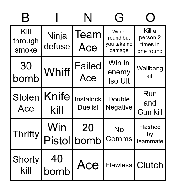 This bingo card has a free space and 24 words: Shorty kill, Win Pistol, Failed Ace, Flawless, Kill a person 2 times in one round, Kill through smoke, Ninja defuse, Team Ace, Double Negative, Run and Gun kill, Stolen Ace, Whiff, No Comms, Flashed by teammate, 30 bomb, 40 bomb, Ace, Win a round but you take no damage, Wallbang kill, Thrifty, Knife kill, 20 bomb, Win in enemy Iso Ult and Clutch.