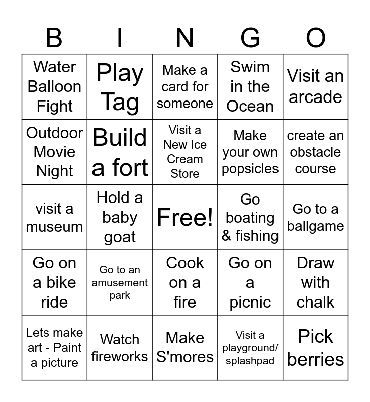 This bingo card has a free space and 24 words: Go to an amusement park, Watch fireworks, Visit a New Ice Cream Store, Lets make art - Paint a picture, Visit an arcade, Water Balloon Fight, Outdoor Movie Night, Play Tag, Go boating & fishing, Cook on a fire, Make your own popsicles, visit a museum, Go on a picnic, Draw with chalk, Build a fort, Visit a playground/ splashpad, Go to a ballgame, Make a card for someone, create an obstacle course, Hold a baby goat, Pick berries, Go on a bike ride, Swim in the Ocean and Make S'mores.