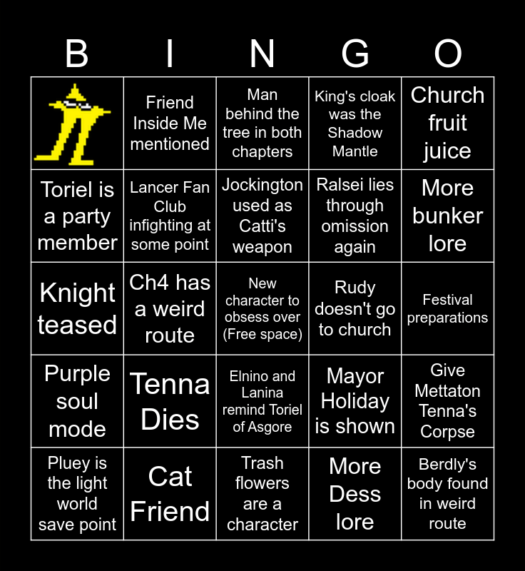 This bingo card has 1 images, a free space and 23 words: Tenna Dies, Cat Friend, Jockington used as Catti's weapon, Pluey is the light world save point, Church fruit juice, Toriel is a party member, Friend Inside Me mentioned, Rudy doesn't go to church, Elnino and Lanina remind Toriel of Asgore, Ralsei lies through omission again, Knight teased, Mayor Holiday is shown, Give Mettaton Tenna's Corpse, Lancer Fan Club infighting at some point, More Dess lore, Festival preparations, Man behind the tree in both chapters, More bunker lore, Ch4 has a weird route, Berdly's body found in weird route, Purple soul mode, King's cloak was the Shadow Mantle and Trash flowers are a character.