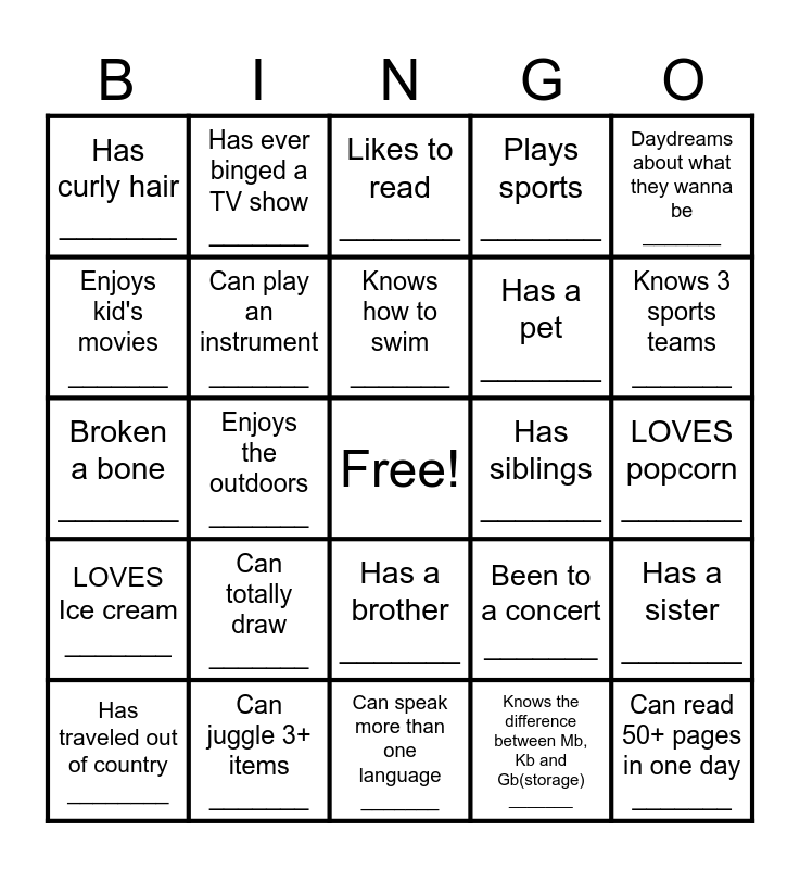 This bingo card has a free space and 24 words: Has traveled out of country ________, Can totally draw _______, Knows how to swim _______, Knows the difference between Mb, Kb and Gb(storage) _______, Daydreams about what they wanna be _______, Has curly hair _______, Has ever binged a TV show _______, Likes to read _______, Has siblings _______, LOVES popcorn _______, Broken a bone _______, Can play an instrument _______, Been to a concert _______, Has a sister _______, Enjoys kid's movies _______, Can juggle 3+ items _______, Can speak more than one language _______, Plays sports _______, Knows 3 sports teams _______, LOVES Ice cream _______, Enjoys the outdoors _______, Has a brother _______, Has a pet _______ and Can read 50+ pages in one day _______.