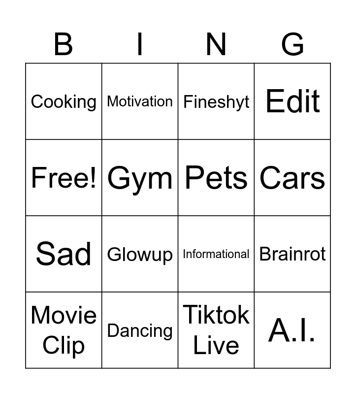 This bingo card has 16 words: Dancing, Brainrot, Fineshyt, Cooking, Sad, Motivation, Informational, Tiktok Live, Free!, Gym, Movie Clip, Edit, Glowup, Cars, Pets and A.I..