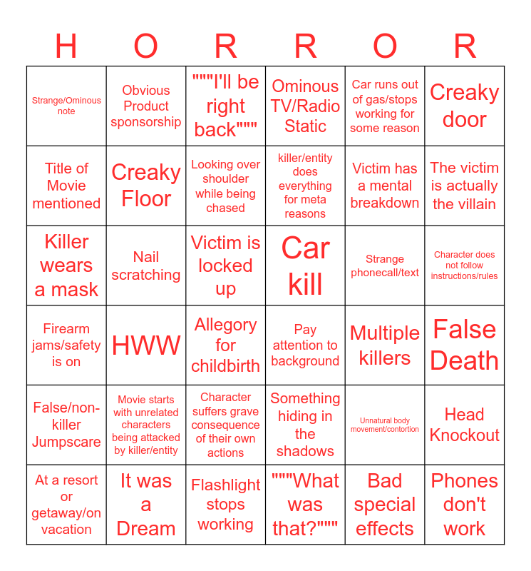 This bingo card has 76 words: Free!, Phones don't work, """I'll be right back""", """I'll get help""", Characters are in an unknown place, """Did you see that?""", """What was that?""", Lights shut off, Flashlight stops working, Victim makes noise while hiding, False/non-killer Jumpscare, Oh no door is locked! D:, Creaky Floor, Creaky door, Bathroom scene, The victim is actually the villain, Something hiding in the shadows, Killer wears a mask, Victim accused of lying/overthinking, Car runs out of gas/stops working for some reason, It was a Dream, Victim has a mental breakdown, Title of Movie mentioned, Obvious Product sponsorship, Ominous TV/Radio Static, Car accident, Character goes into basement/attic, Phone battery is dead, No cell service, Bully/asshole character dies, At a resort or getaway/on vacation, Terrible audio mixing, Unnecessary monster reveal, Firearm jams/safety is on, killer/entity does everything for meta reasons, Looking over shoulder while being chased, Law enforcement is useless/actively makes things worse, Victim trips while running, Victim is locked up, False Death, Characters realize they fit into archetypes, Locals are scary and unhelpful/are in on it, Character backs up into grave danger, “Last girl” dies at the end / PCS, Person mentions how black people always die in horror movies, Movie starts with unrelated characters being attacked by killer/entity, Allegory for childbirth, Strange/Ominous note, Unusual body fluid, It was a hallucination, Character suffers grave consequence of their own actions, Character does not follow instructions/rules, Teeth fall/pulled out, Bad special effects, Inaccurate science, Scene with Insect(s), Unnatural body movement/contortion, Excessive drinking, Excessive drugs, Hospital scene, Strange phonecall/text, evil domesticated animal, character ignores obvious warning signs, characters find an evil hidden artifact, New home, Unsettling Smile, Nail scratching, Head Knockout, Killer has unrealistic/superhuman ability, Lights Flicker, HWW, Car kill, Pay attention to background, Church scene, Multiple killers and "Did you hear that/something?".