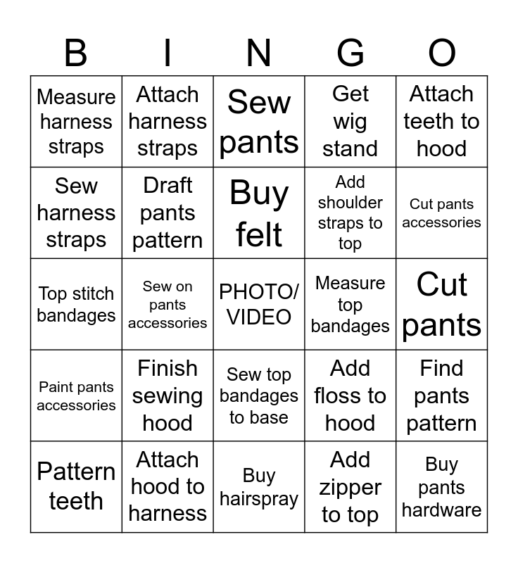 This bingo card has a free space and 24 words: Finish sewing hood, Attach hood to harness, Buy felt, Pattern teeth, Attach teeth to hood, Measure harness straps, Sew harness straps, Attach harness straps, Measure top bandages, Sew top bandages to base, Add shoulder straps to top, Top stitch bandages, Add floss to hood, Find pants pattern, Draft pants pattern, Add zipper to top, Cut pants, Sew pants, Cut pants accessories, Sew on pants accessories, Buy pants hardware, Paint pants accessories, Get wig stand and Buy hairspray.