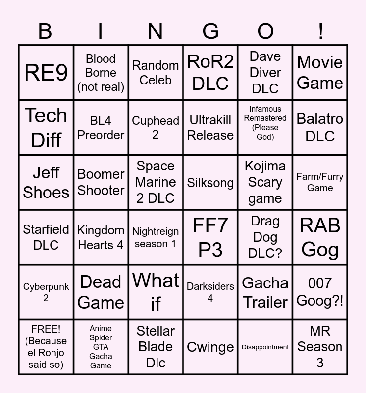 This bingo card has 36 words: Darksiders 4, What if, Cwinge, Tech Diff, Starfield DLC, Silksong, BL4 Preorder, Stellar Blade Dlc, Dave Diver DLC, Gacha Trailer, Balatro DLC, RoR2 DLC, 007 Goog?!, Boomer Shooter, Ultrakill Release, RE9, Cyberpunk 2, Kojima Scary game, Jeff Shoes, Random Celeb, Space Marine 2 DLC, Kingdom Hearts 4, FF7 P3, Nightreign season 1, Drag Dog DLC?, Blood Borne (not real), Infamous Remastered (Please God), Anime Spider GTA Gacha Game, Cuphead 2, Movie Game, MR Season 3, FREE! (Because el Ronjo said so), RAB Gog, Farm/Furry Game, Dead Game and Disappointment.