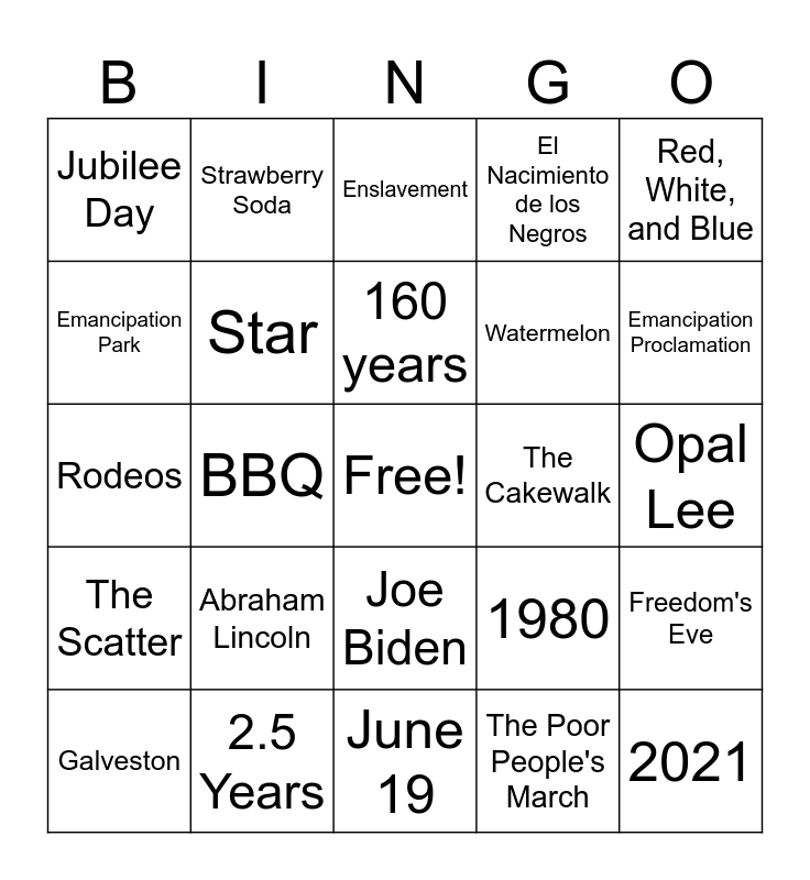 This bingo card has a free space and 24 words: Abraham Lincoln, 2.5 Years, 160 years, Galveston, Red, White, and Blue, Jubilee Day, Emancipation Park, Strawberry Soda, The Cakewalk, Joe Biden, Watermelon, Rodeos, 1980, Freedom's Eve, Star, The Poor People's March, Opal Lee, Enslavement, Emancipation Proclamation, BBQ, 2021, The Scatter, El Nacimiento de los Negros and June 19.